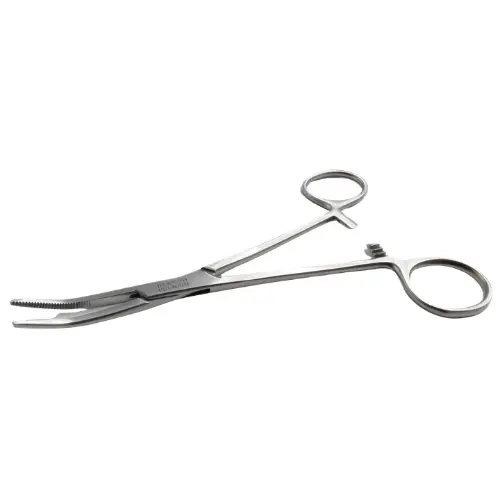 La pinza Kelly curva de 20 cm es un instrumento quirúrgico elaborado en acero inoxidable de calidad, diseñado para la hemostasia y manipulación de tejidos en diversos procedimientos. Sus mandíbulas curvas con estriado transversal parcial permiten un agarre firme y controlado, reduciendo el riesgo de daño tisular. Su mayor longitud facilita el acceso a zonas más profundas del campo quirúrgico, mientras que el sistema de cierre tipo cremallera asegura una presión constante y segura durante su uso.